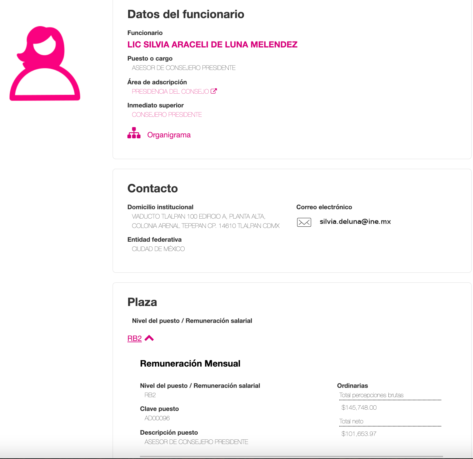 Silvia Araceli de Luna, una Contadora Pública con amplia experiencia en la Unidad de Inteligencia Financiera y la Unidad Financiera de la extinta PGR, quien se encarga del manejo operativo y financiero del Presidente del INE.
